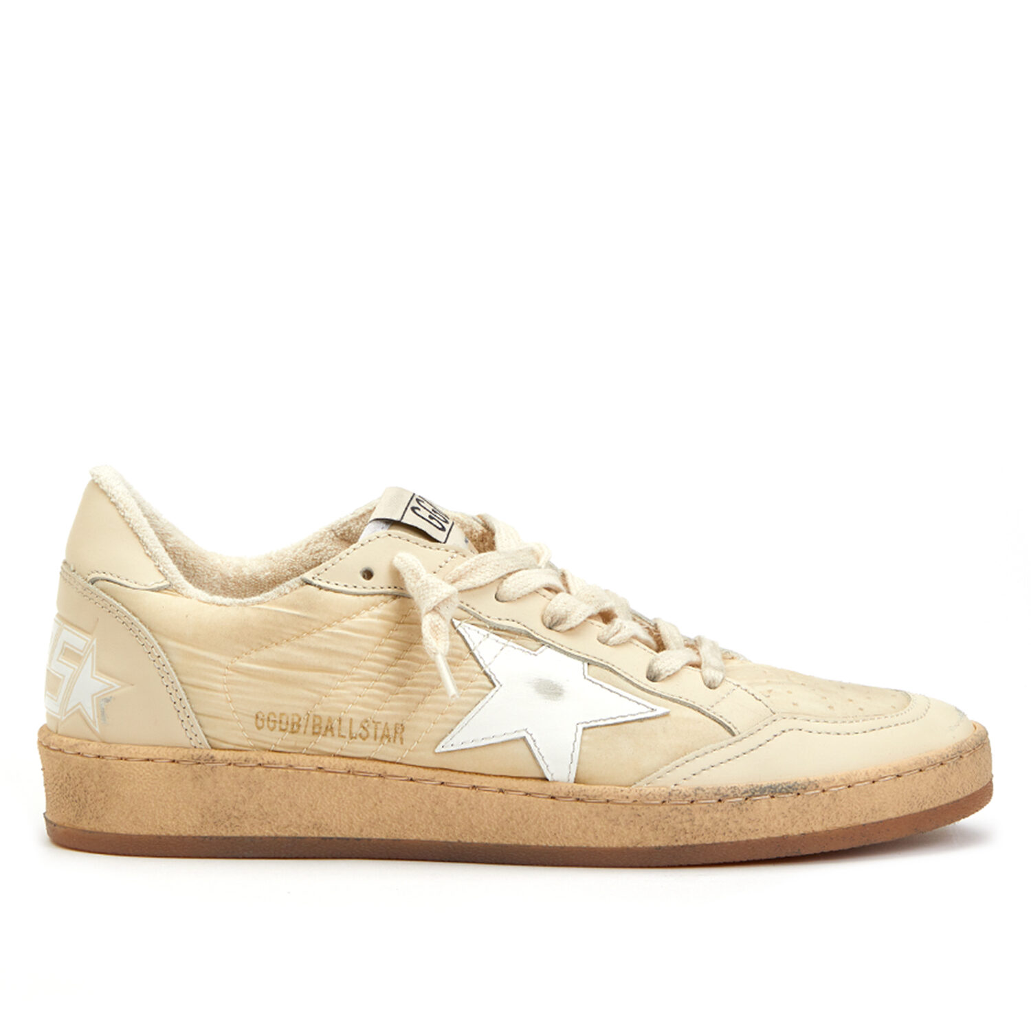 These GG Ball Star sneakers are a blend of polyamide and leather with a clean, cream-colored finish. The low-top design features a round toe, a lace-up closure, and a durable rubber sole. The shoes are detailed with a subtle brand logo, combining a classic silhouette with high-quality materials for a versatile and stylish look.
