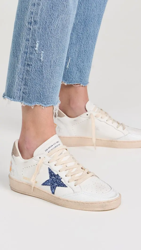GG Ball Star Low-Top Sneakers in White Leather featuring Light Blue Star & Taupe Accents