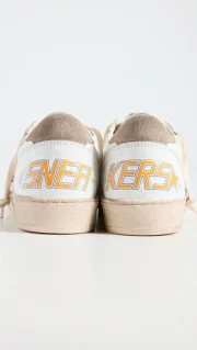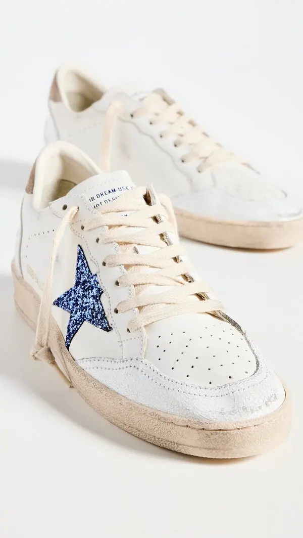 Low-top sneakers crafted in Italy from smooth white leather with taupe suede inserts and a contrasting light blue star appliqué. Featuring lace-up closure, perforated toe box, branded tongue and heel counter, and a flat rubber sole with the brand’s signature intentionally distressed finish for a vintage-inspired edge. The design draws from ’80s American college basketball culture, blending sporty charm with artisanal detailing.