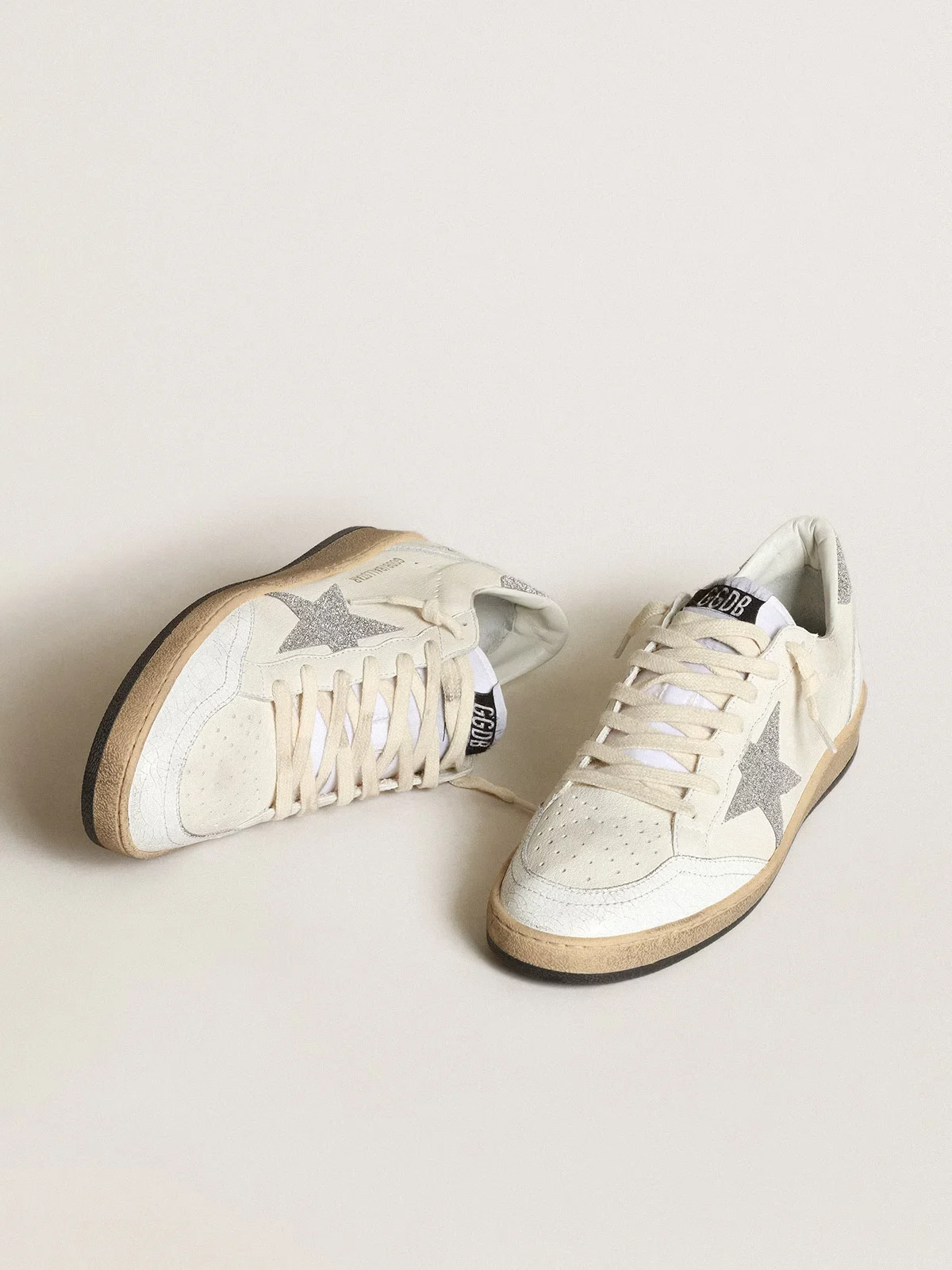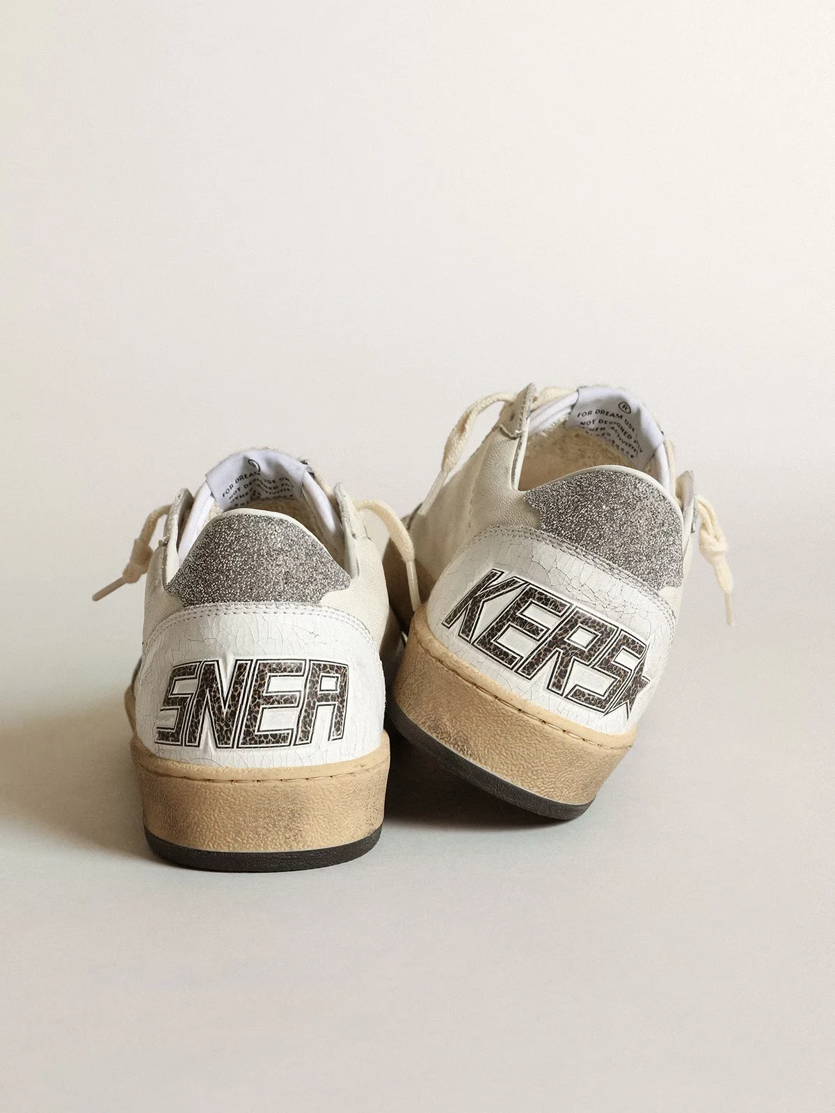 Our Ball Star sneakers channel the American college spirit—somewhere between a hoop shot and a skateboard ride. This edition in white nappa features a star and heel tab embellished with silver-colored Swarovski micro-crystals. White crackle leather inserts and classic white laces seal a timeless look with sparkle.